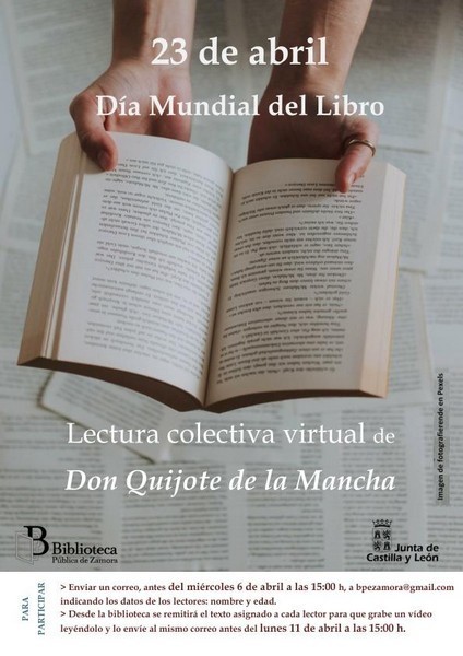 Un año más, la Biblioteca Pública de Zamora celebra el 23 de abril, Día Mundial del Libro y de los Derechos de Autor, con una lectura colectiva virtual del Quijote. Desde 2020, por las especiales circunstancias de la crisis sanitaria de aquel momento, esta conmemoración se traslada al mundo virtual en forma de vídeo con las colaboraciones de los lectores desde sus hogares.