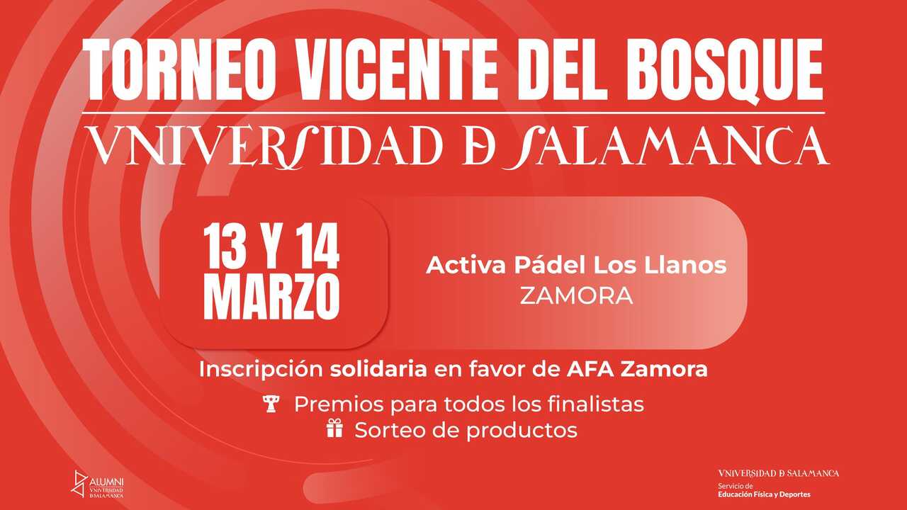 Los días 13 y 14 de marzo, Zamora se convertirá en escenario deportivo y solidario con la celebración de una nueva edición del Torneo Vicente del Bosque de pádel, organizado por el Servicio de Educación Física y Deportes de Alumni Universidad de Salamanca.