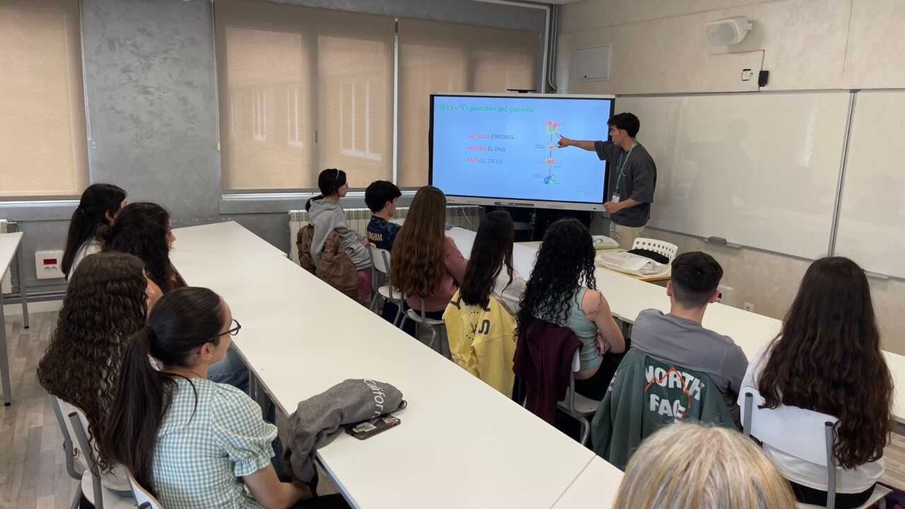 Durante las charlas, el alumnado pudo conocer de forma accesible qué es el cáncer, cómo se desarrolla la enfermedad y el papel clave de la investigación científica en su prevención, diagnóstico y tratamiento. Además, Miñambres compartió su propio proyecto de investigación en cáncer de mama, acercando la realidad del trabajo científico y destacando la importancia del compromiso social y científico desde edades tempranas.