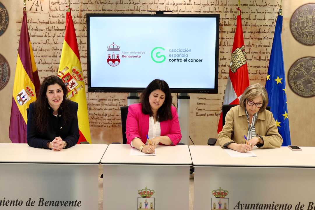 La firma del convenio ha tenido lugar en el Edificio Administrativo El Ferial y ha contado con la presencia de la alcaldesa de Benavente, Beatriz Asensio, la concejala de Bienestar Social, Mercedes Benítez, y la presidenta de la sede local de la AECC en Benavente, Carmen Prieto.