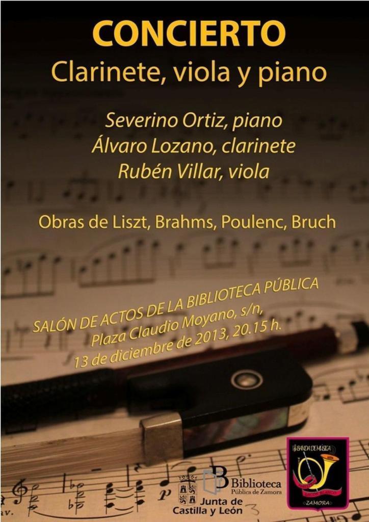 En este concierto de música de cámara se interpretarán obras de Liszt, Brahms, Poulenc y Bruch y los intérpretes de la banda de Música Maestro Nacor Blanco serán Severino Ortiz al piano, Álvaro Lozano al clarinete y Rubén Villar a la viola.