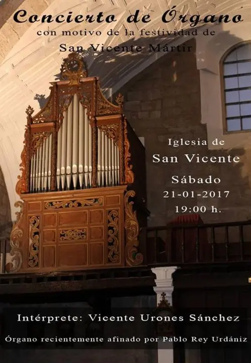 La iglesia de San Vicente acoge mañana sábado a las 19 horas un concierto de órgano del zamorano Vicente Urones. Organizado por la parroquia, el concierto celebra la festividad del santo titular del templo y la afinación del órgano que ha realizado Pablo Rey Urdániz.