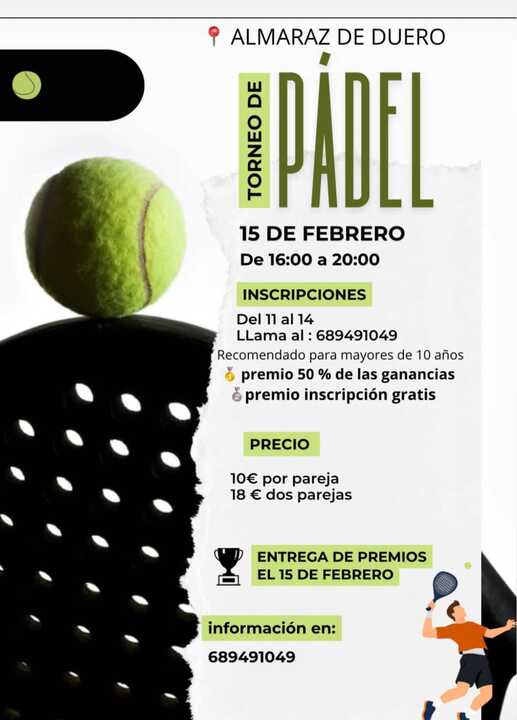 Almaraz de Duero celebrará el próximo 15 de febrero un torneo de pádel que tendrá lugar en horario de 16:00 a 20:00 horas. La competición está recomendada para mayores de 10 años y promete una jornada deportiva llena de emoción.