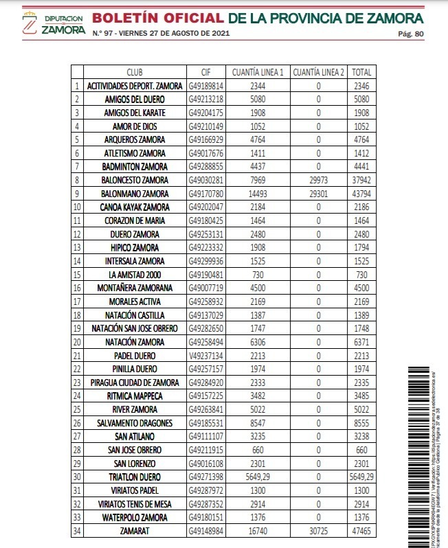 Todo el listado de la cuantía y los clubes se han publicado el pasado 27 de agosto en el Boletín Oficial de la Provincia (BOP):