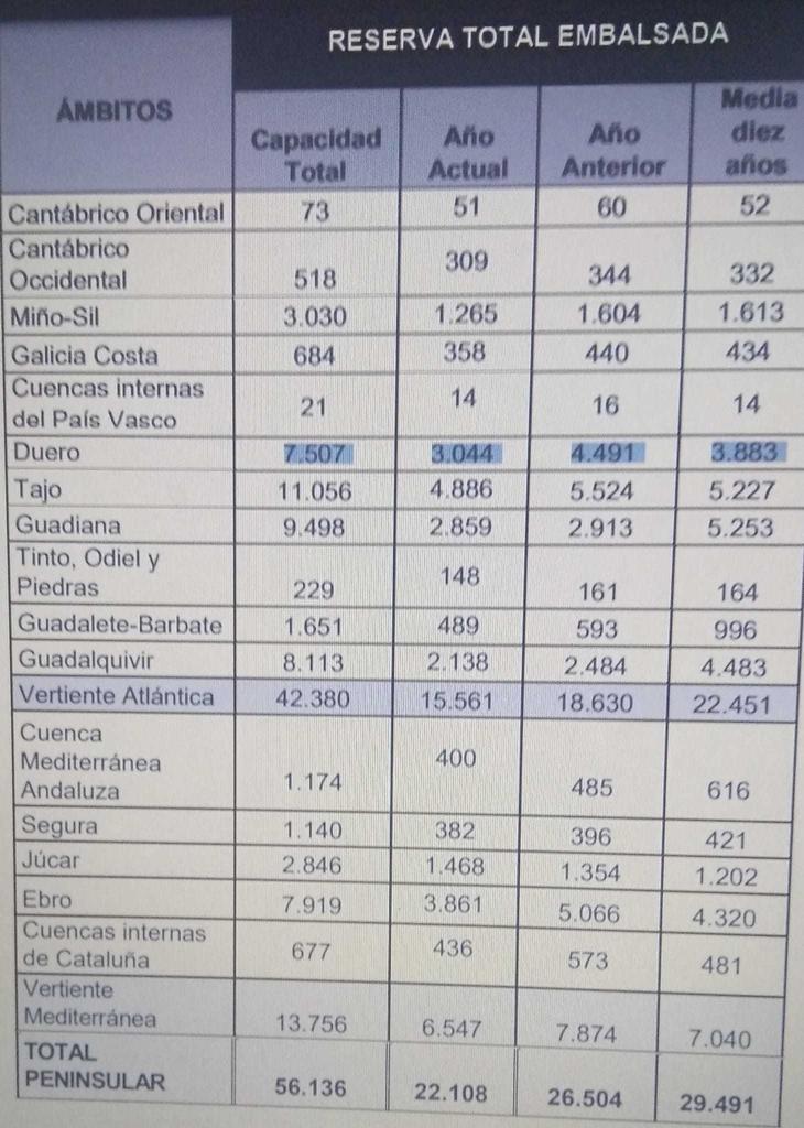 La reserva hídrica española está al 39,4 por ciento de su capacidad total. Los embalses almacenan actualmente 22.108 hectómetros cúbicos (hm³) de agua, disminuyendo en la última semana en 97 hectómetros cúbicos (el 0,2 por ciento de la capacidad total actual de los embalses).