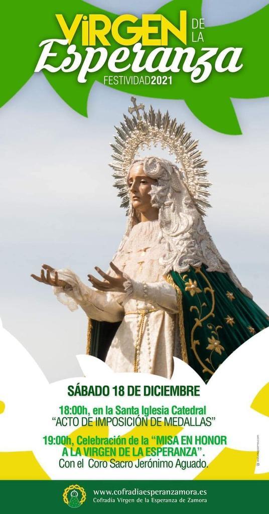 El próximo sábado 18 de diciembre la Catedral de Zamora será epicentro zamorano de la festividad de la "Virgen de la Esperanza". Para conmemorar una jornada tan especial la imagen titular de la cofradía será expuesta desde la apertura hasta el cierre del templo para que los fieles puedan acercarse a la "Virgen de la Esperanza" y poder encomendarse a ella.