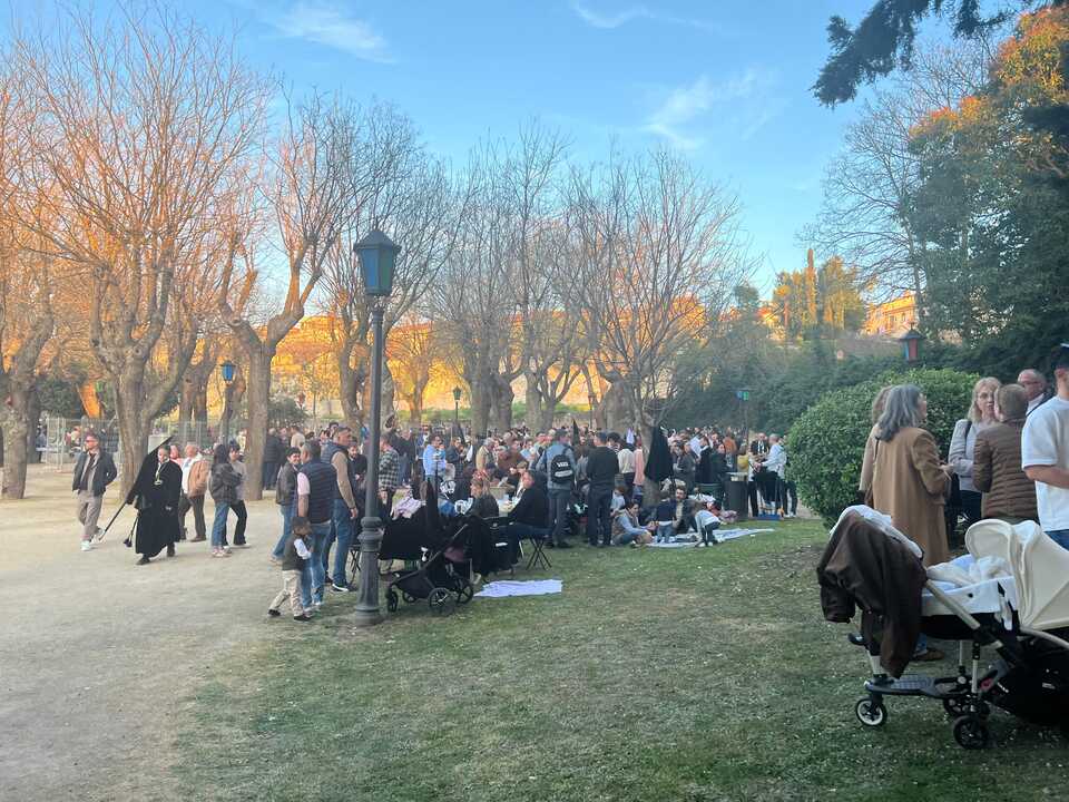 Los jardines del Castillo, las Peñas de Santa Marta y la Puerta de la Lealtad presentaron una imagen de lleno absoluto desde primeras horas de la tarde. Grupos de amigos, familias enteras y cofrades aprovecharon el paréntesis previo a la procesión para compartir mesa improvisada y conversación en uno de los rituales más arraigados de la Semana Santa.