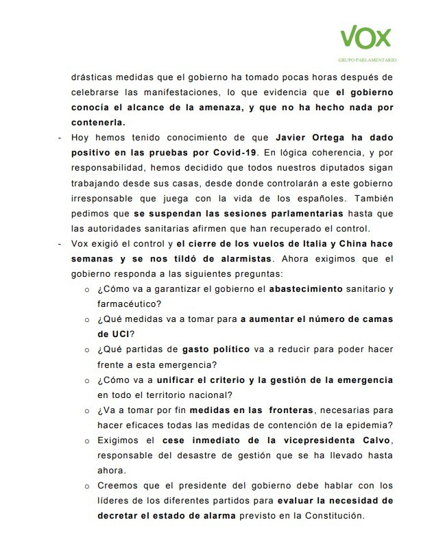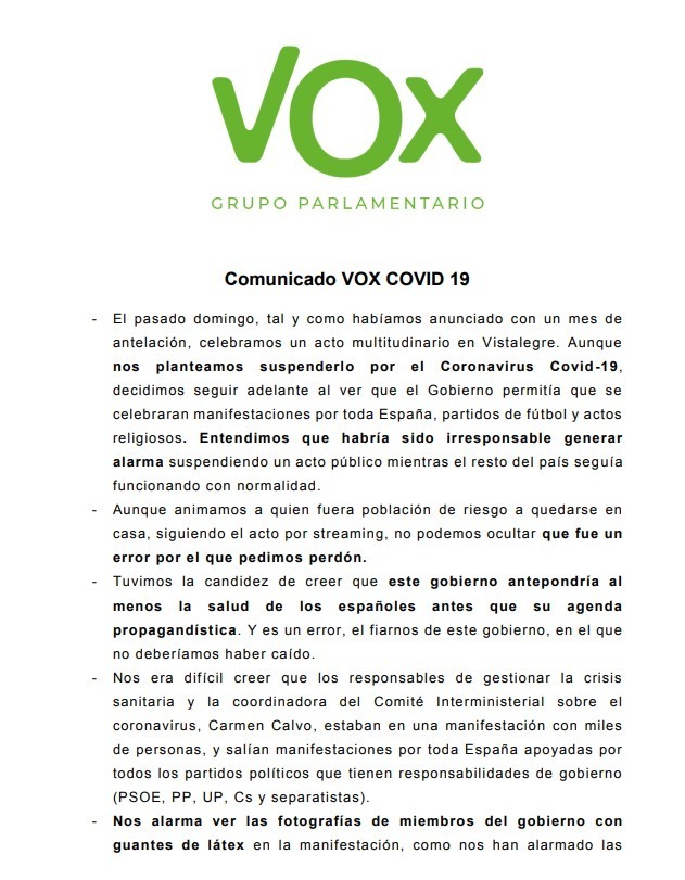 El presidente del partido, Santiago Abascal, ha publicado en su cuenta de twitter un comunicado sobre la decisión de llevar a cabo el acto. En el tweet del presidente de VOX se puede leer que ante la decisión del Gobierno de llevar a cabo manifestaciones, eventos deportivos y religiosos, tomaron la decisión de seguir con Vistalegre, sin embargo, lanza una serie de cuestiones tras el positivo de Javier Ortega Smith.
