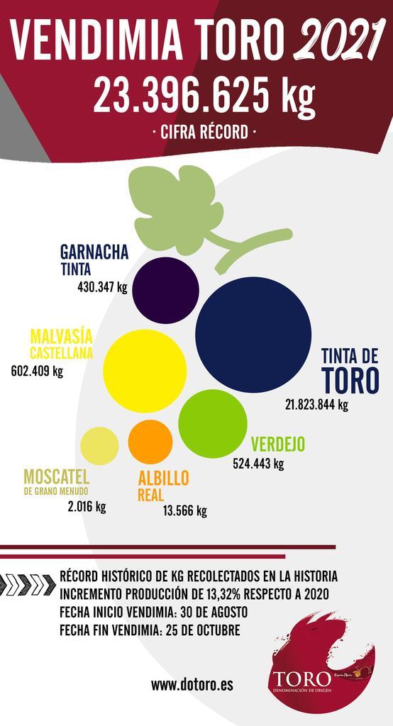 La vendimia en Toro casi ha finalizado con una cifra de 23.396.625 millones de kg de uvas recogidos logrando posicionarse como la vendimia en la que más kilogramos de uva se han recolectado y recibido en bodega en toda la historia de la D.O. Toro.