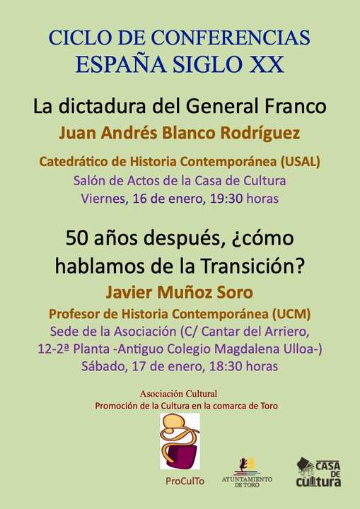 El ciclo se abre el viernes 16 de enero, a las 19:30 horas, en el Salón de Actos de la Casa de Cultura de Toro, con la conferencia titulada “La dictadura del general Franco”, a cargo de Juan Andrés Blanco Rodríguez, catedrático de Historia Contemporánea de la Universidad de Salamanca y director de la Cátedra de Memoria Democrática de dicha institución.