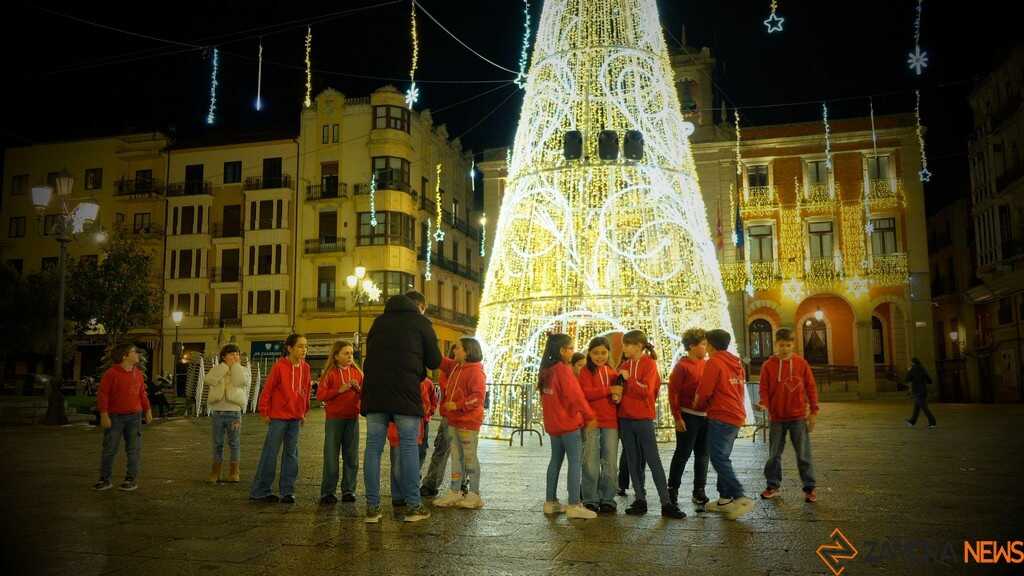 La lluvia dio una tregua este martes y permitió que el Colegio Trilema Zamora compartiera con los zamoranos, en la Plaza Mayor de la ciudad, su villancico original “Brilla porque es Navidad”, una composición creada e interpretada por los alumnos de 3º y 4º de Educación Primaria que participa en el Concurso Nacional de Villancicos de Cadena 100.