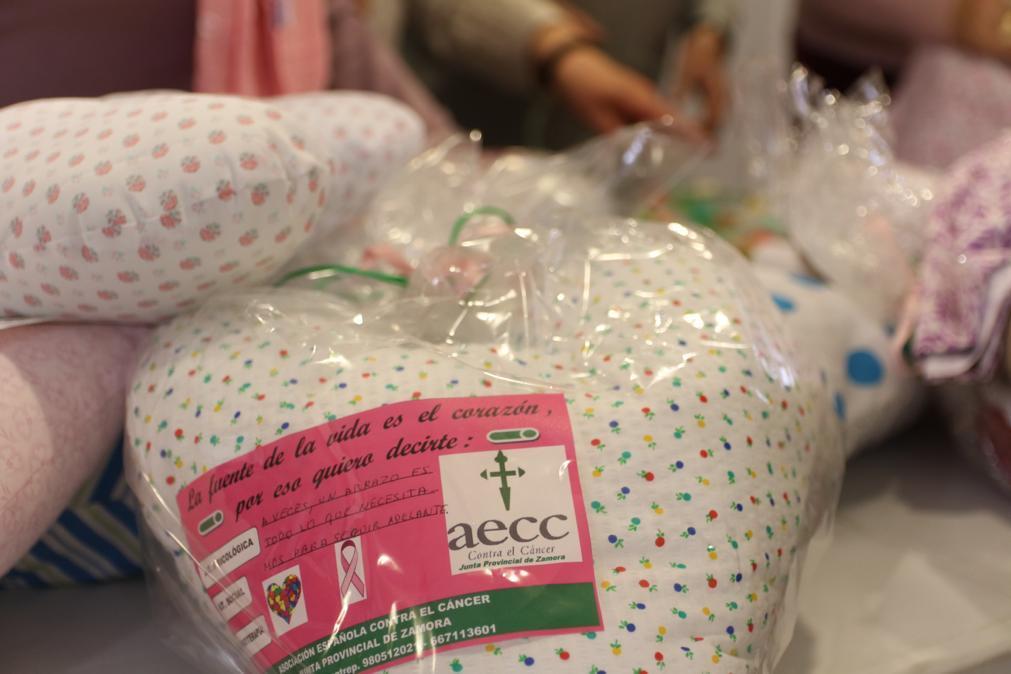 La Asociación Española Contra el Cáncer otorga unos cojines en forma de corazón para las personas enfermes de cáncer de mama, para que se lo puedan poner bajo el brazo.