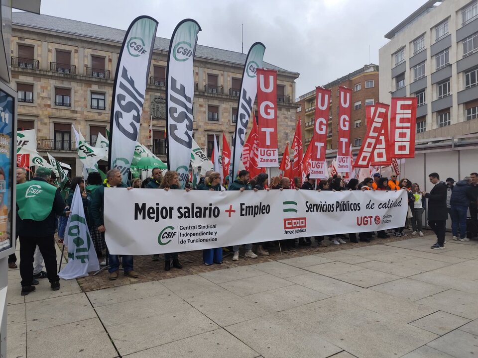 Los tres sindicatos con representación en el sector público en Zamora —UGT, CCOO y CSIF— han salido este jueves a la calle dentro de una movilización nacional para denunciar la pérdida de poder adquisitivo de los empleados públicos y la falta de negociación por parte del Gobierno. En la concentración, celebrada en la plaza de la Constitución frente a la Subdelegación del Gobierno, los representantes sindicales advirtieron de que, si no se abre el diálogo, podrían convocar una huelga general.