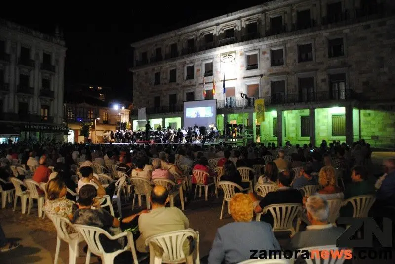 La noche del sábado fue de cine y música para los que se dieron cita en la Plaza de la Constitución. La Banda de Música Cidade de Espinho portuguesa dejó sin sillas a muchos zamoranos que intentaron ver sentados un espectáculo de versiones originales de bandas sonoras de películas y música clásica elegida para agasajar especialmente a los zamoranos