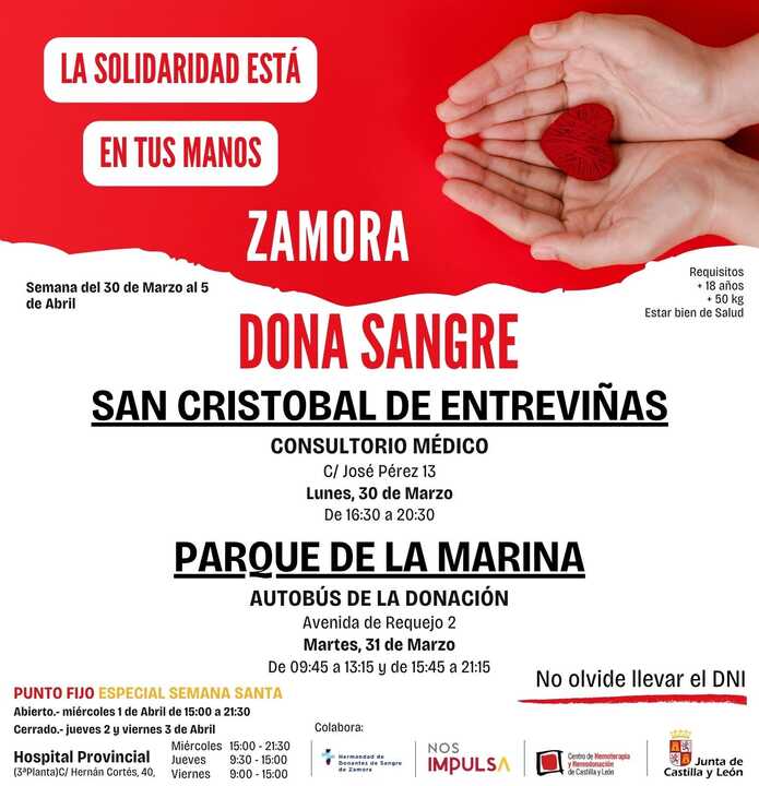Para quienes no puedan acudir al maratón del día 31, permanece activo el punto fijo de donación en el Hospital Provincial de Zamora, con horario de miércoles de 15:00 a 21:30 horas, jueves de 09:30 a 15:00 horas y viernes de 09:00 a 15:00 horas.