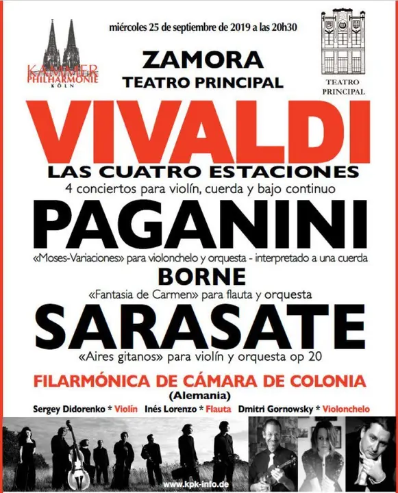 Reino Unido, Irlanda, Escandinavia, Alemania, Francia, Australia o España son los países que la Orquesta Filarmonía de Cámara de Colonia ha recorrido y sigue recorriendo gracias a sus éxitos cosechados en cada una de sus giras. Nuestra orquesta se siente como en casa allá donde va y en el caso de España serían muy largas de enumerar las razones por las cuales para nosotros siempre es un gozo regresar; las buenas atenciones recibidas, el entusiasmo de su público en nuestros conciertos, el clima, etc... y por eso es un placer poder presentar nuestro programa por primera vez en Zamora y compartir con su público nuestra pasión por la música, con piezas de compositores como Vivaldi, Paganini, Sarasate...