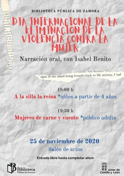 Con motivo de la celebración del Día Internacional de la Eliminación de la Violencia contra la Mujer el miércoles 25 de noviembre, la Biblioteca Pública de Zamora recibe a la narradora y especialista en Literatura Infantil y Juvenil Isabel Benito, con dos sesiones para diferentes públicos.