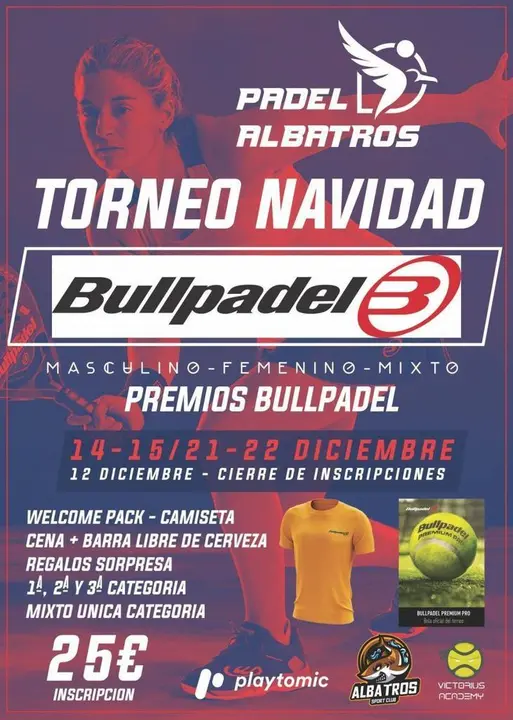 El Torneo de Navidad del club deportivo Pádel Albatros a abierto su periodo de inscripción hasta el próximo 12 de diciembre. La competición se celebrará en las instalaciones del club (Calle Andres Fernández de Andrada, 37) durante los fines de semana del 114 y el 15 y el 21 y 22 de diciembre.