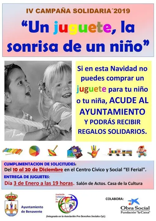 La asociación Solidaridad en Acción (ASEA) y el Ayuntamiento de Benavente organizan la IV Edición de la CAMPAÑA SOLIDARIA´2019: "Un juguete, la sonrisa de niño", y que en esta edición cuenta con la colaboración financiera de la Fundación La Caixa.