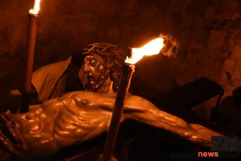 Las llamas de las teas y los hábitos blancos de los penitentes formaban un cortejo de luz que precedía al Cristo de la Buena Muerte, uno de los mejores crucificados de Zamora, salido de la gubia de Juan Ruiz de Zumeta en el siglo XVII.