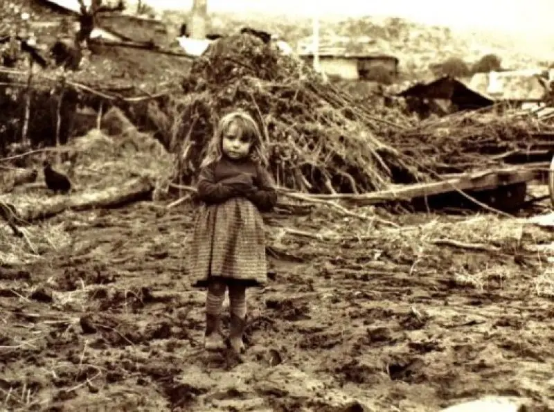 El mundo se conmovió con las imágenes de la catástrofe en blanco y negro, con los pequeños pies desnudos de los niños entre el barro, con la madre apretando a su hijo contra su pecho contemplando la nada; con la silueta negra de las ancianas al pie del agua esperando que el agua les devolviese los cuerpos de los suyos; con cadáveres de animales, restos de muebles, cunas o muñecas a la deriva entre el fango; con las cuencas vacías de un ciego que tuvo la suerte de no ver tanta desgracia; con la violencia de un carro empotrado contra la puerta de una iglesia reventada o la soledad de un santo de madera secándose en la orilla; con los restos amontonados de lo que fueron casas y establos; con los supervivientes, hombres, mujeres y niños, abrigados bajo las mantas y toquillas de la caridad, resignados de acá para allá como ángeles expulsados del paraíso.